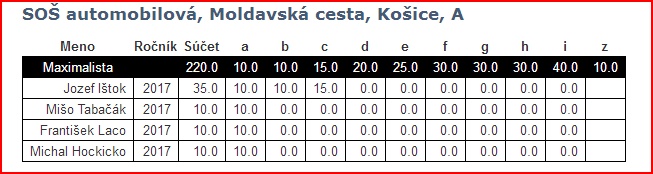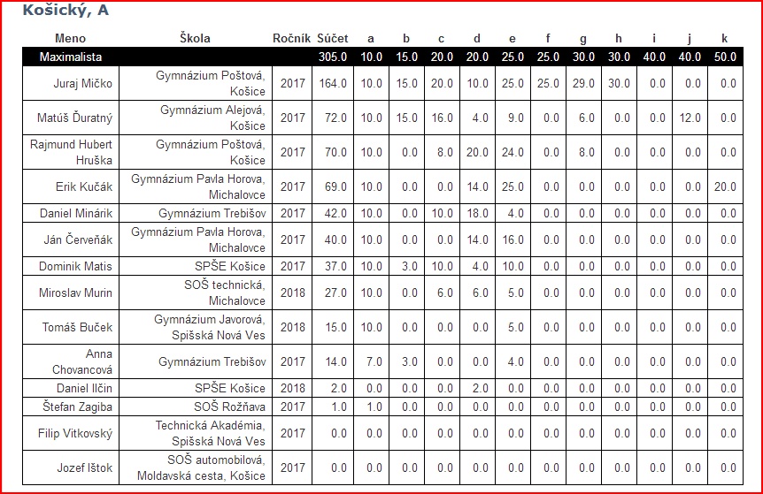Porovnanie výsledkov školského kola s minulým školským rokom: v tomto školskom roku naši žiaci dosiahli lepšie výsledky oproti minulému školskému roku. Maximálny počet získaných bodov na žiaka bol 35 bodov, tento školský rok. Minulý školský rok maximálny získaných bodov na žiaka bol 20 bodov. V rámci Košického kraja v kategórii „A“ sa najlepšie umiestnil žiak Jozef Ištok. Obsadil pekné 47 miesto zo 67-ich. V kategórii „B“ sa najlepšie umiestnil žiak Dávid Berko. Obsadil tiež pekné miesto 19 z 35 žiakov. Vzhľadom nato, že naša škola má málo hodín programovania, len jedna hodina týždenne a to len v druhých ročníkoch štúdia odborov mechanik elektrotechnik a mechanik počítačových sietí, hodnotím dosiahnutý výsledok v školskom kole za výborný. Je to maximum, čo sme mohli dosiahnuť.