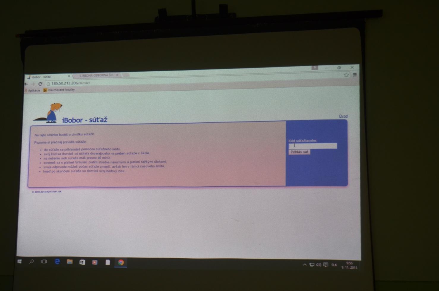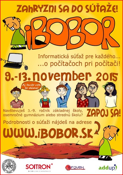 Dňa 9. a 10.11.2015 sa uskutočnilo školské kolo v súťaži iBOBOR 2015. 9.novembra 2015 súťažila kategória „JUNIOR“ a 10.novembra 2015 súťažila kategória „SENIOR“. Súťaž sa uskutočnila v počítačovej učebni U6. Na súťaž sa prihlásilo 34 žiakov, viď. nasledujúca tabuľka. Z nich súťažilo 28 žiakov. Ped. dozor a koordinátor bol: RNDr.M.Balažka.