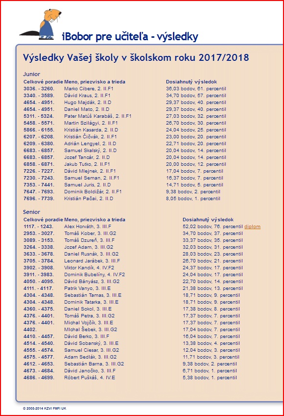 Oficiálne výsledky žiakov našej školy celoštátneho online kola od organizátora súťaže IBobor_2017/2018, viď Tabuľka 2.: