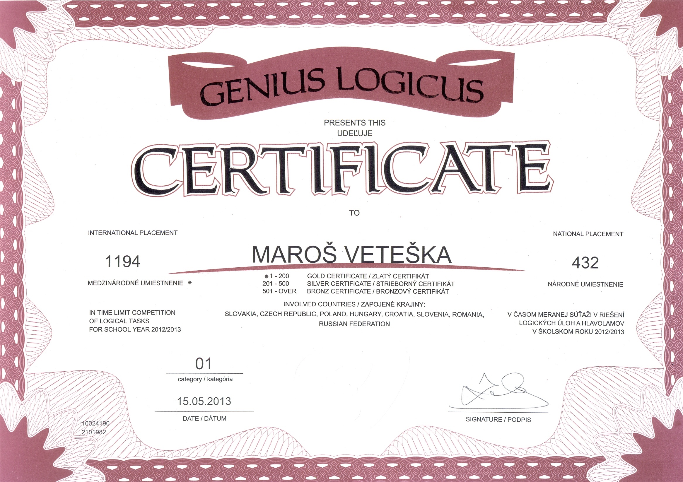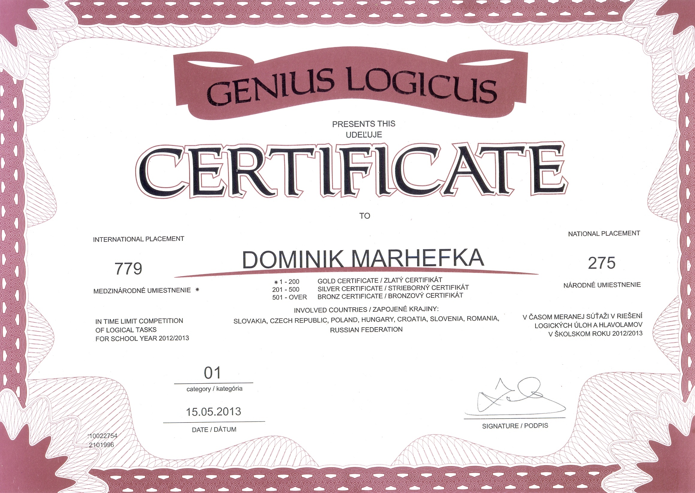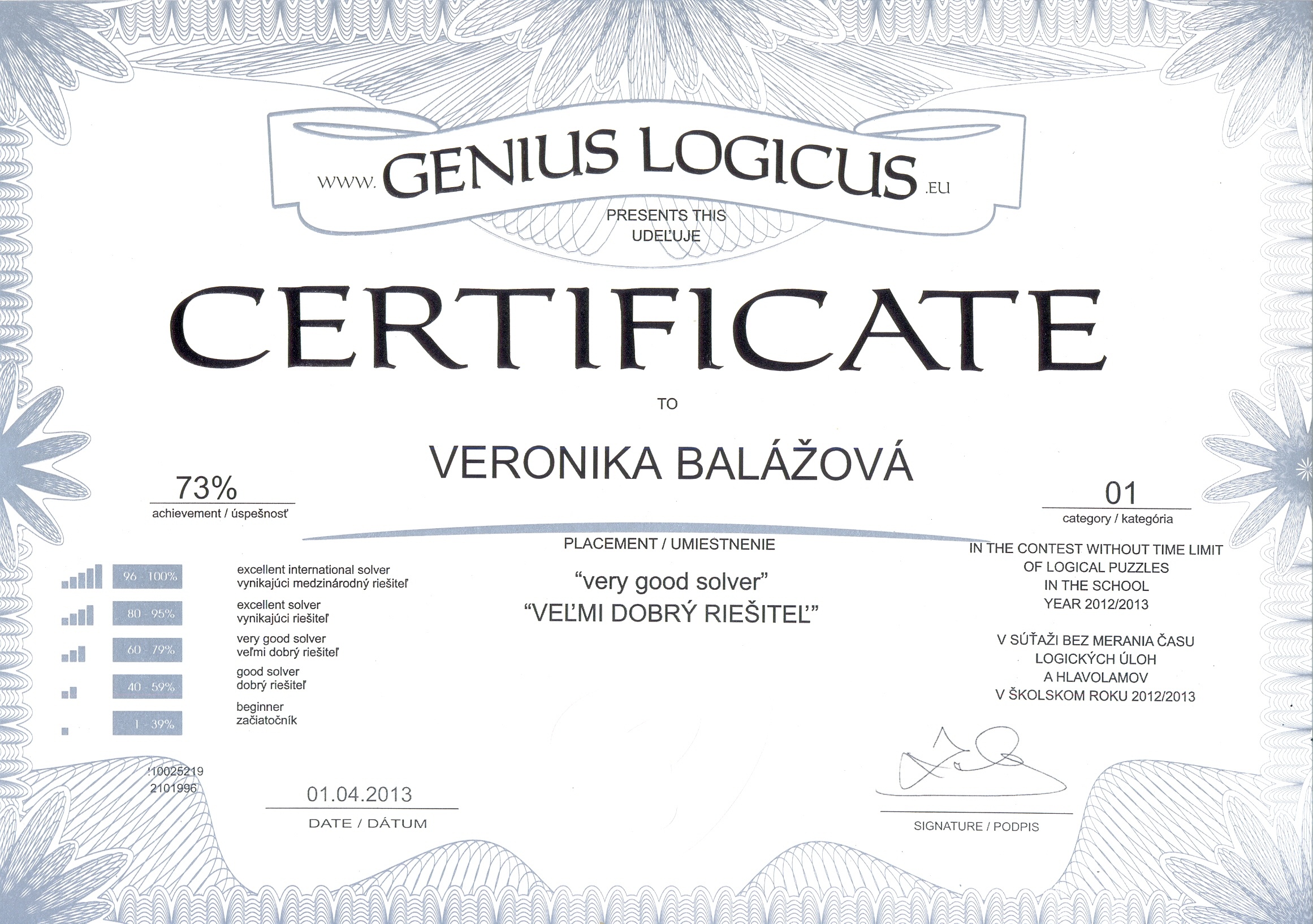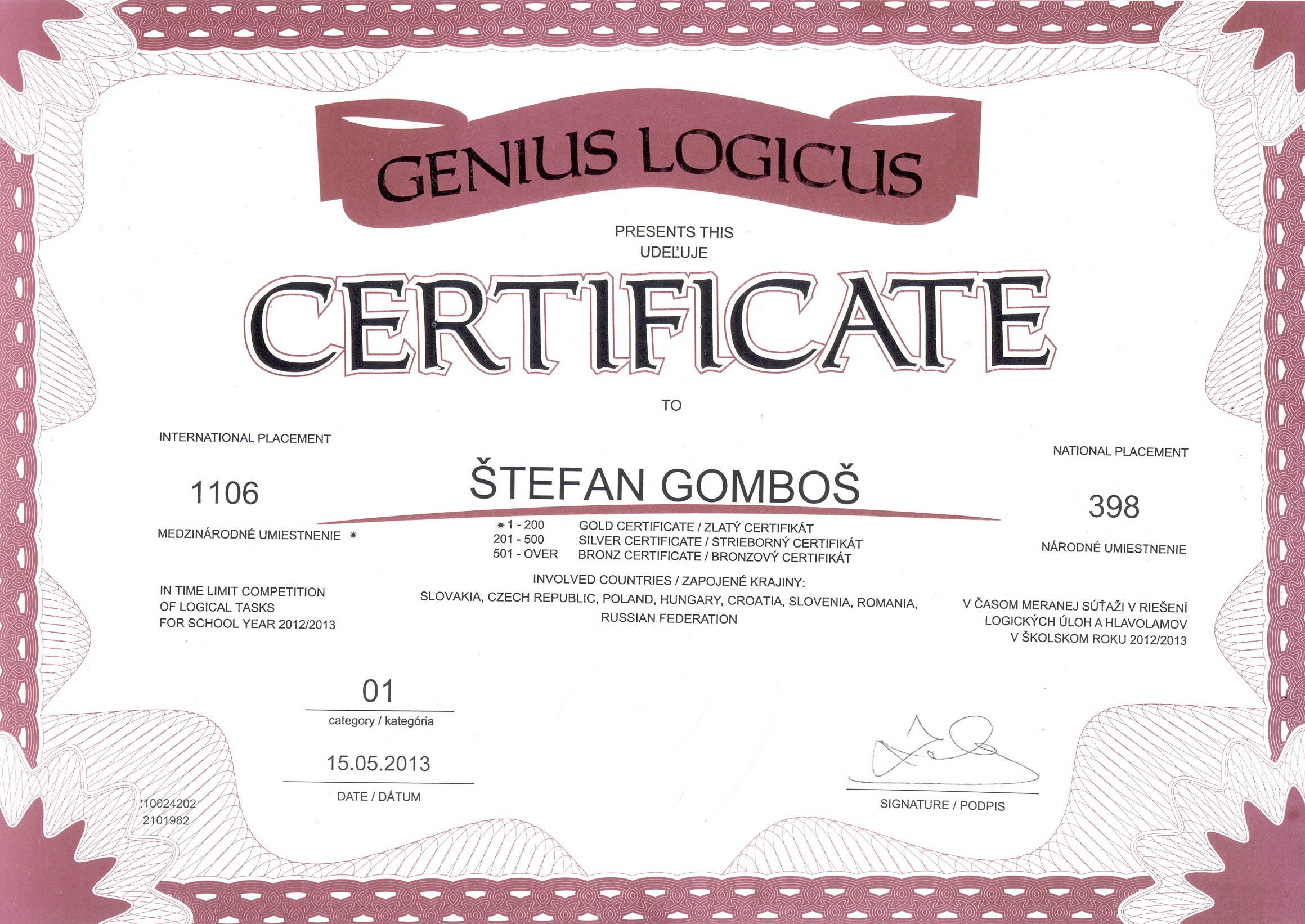 Aj v školskom roku 2012/2013 sme na našej škole zorganizovali medzinárodnú informatickú súťaž GENIUSLOGICUS. V tomto školskom roku bolo zapojených do súťaže 23 žiakov. Všetci žiaci súťažli v kategórii "A+B". Katogória "B" s meraním času prebehla 5.apríla 2013, ktorej sa zúčastnilo 17 žiakov z 23 prihlásených. Oficiálne výsledky budú zverejnené do konca školského roku aj na našej webovej stránke. V júni 2013 organizátori súťaže ocenili súťažiacich získanými certifikátmi a koordinátorom súťaže: Mgr. Daniela Filčáková a RNDr. Marián Balažka poďakovali za organizáciu súťaže na našej škole. Mgr. D. Filčáková zapojila ďalších 12 žiakov do súťaže.
