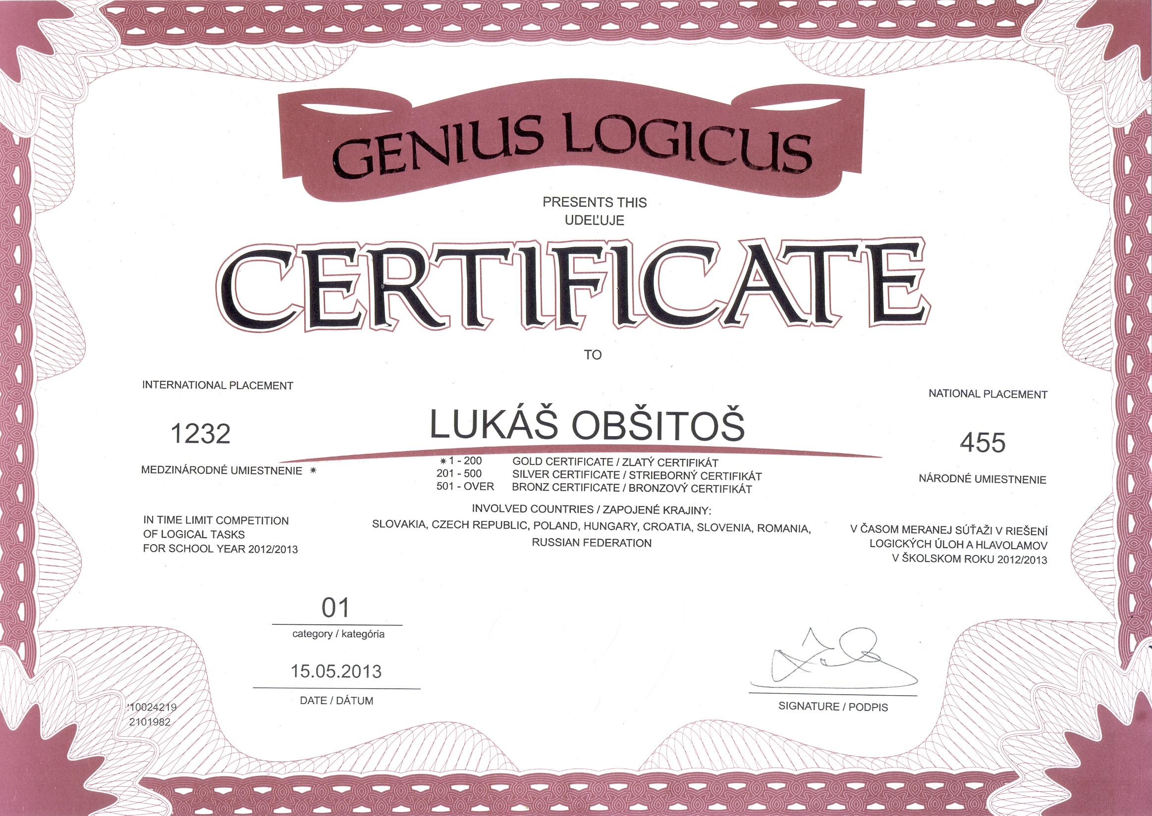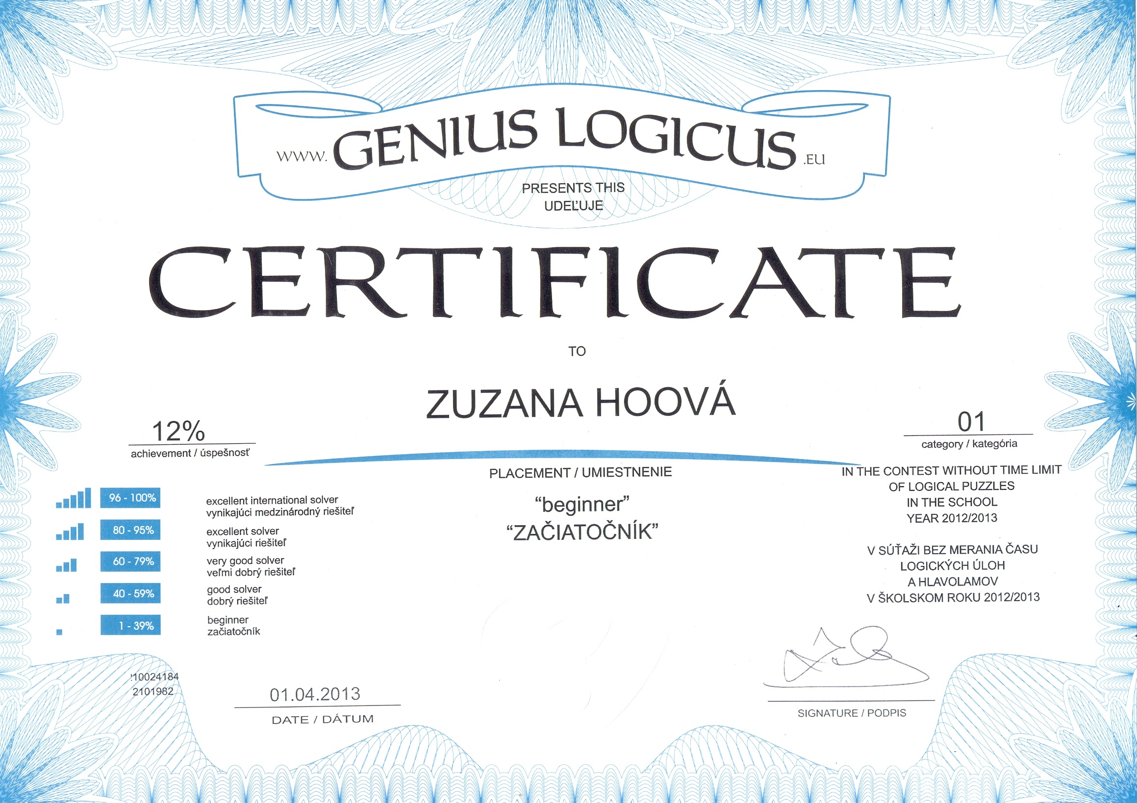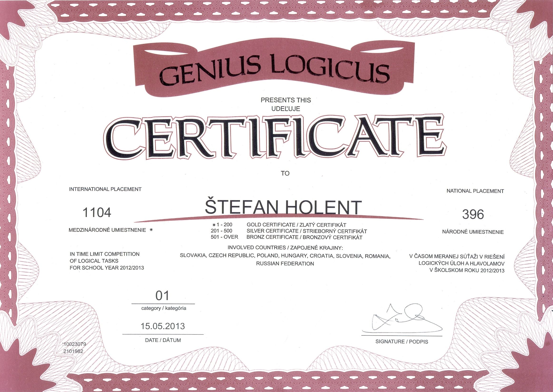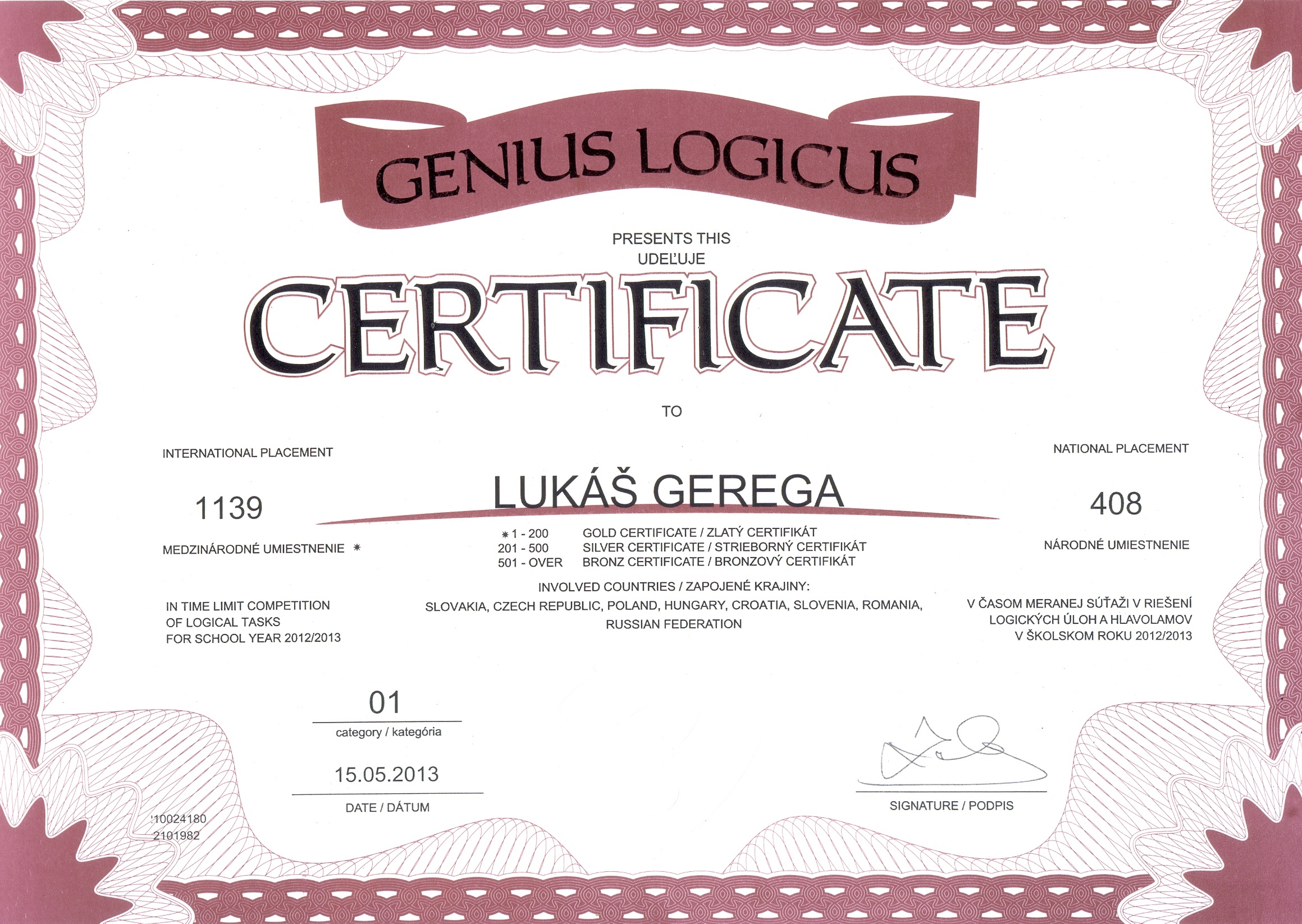 Aj v školskom roku 2012/2013 sme na našej škole zorganizovali medzinárodnú informatickú súťaž GENIUSLOGICUS. V tomto školskom roku bolo zapojených do súťaže 23 žiakov. Všetci žiaci súťažli v kategórii "A+B". Katogória "B" s meraním času prebehla 5.apríla 2013, ktorej sa zúčastnilo 17 žiakov z 23 prihlásených. Oficiálne výsledky budú zverejnené do konca školského roku aj na našej webovej stránke. V júni 2013 organizátori súťaže ocenili súťažiacich získanými certifikátmi a koordinátorom súťaže: Mgr. Daniela Filčáková a RNDr. Marián Balažka poďakovali za organizáciu súťaže na našej škole. Mgr. D. Filčáková zapojila ďalších 12 žiakov do súťaže.
