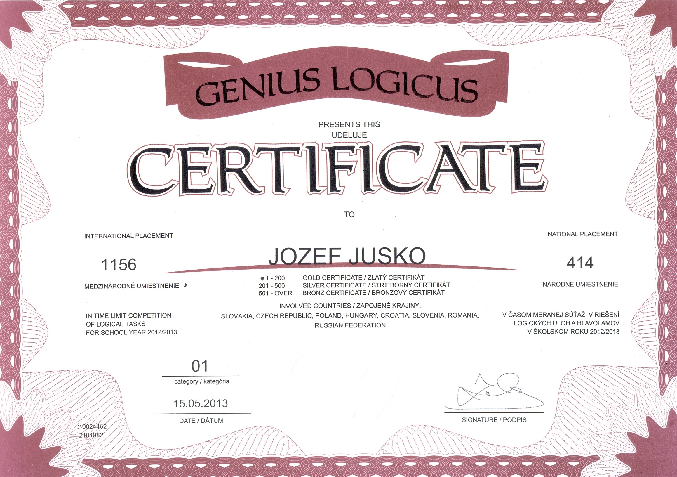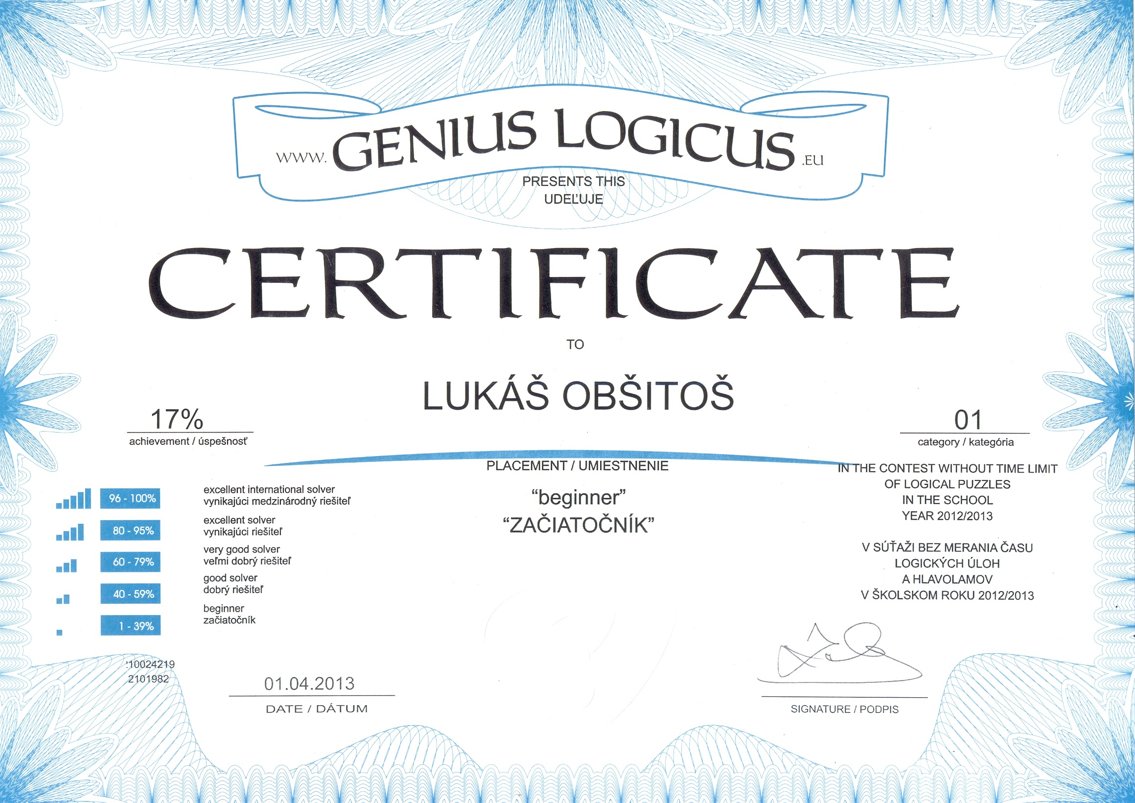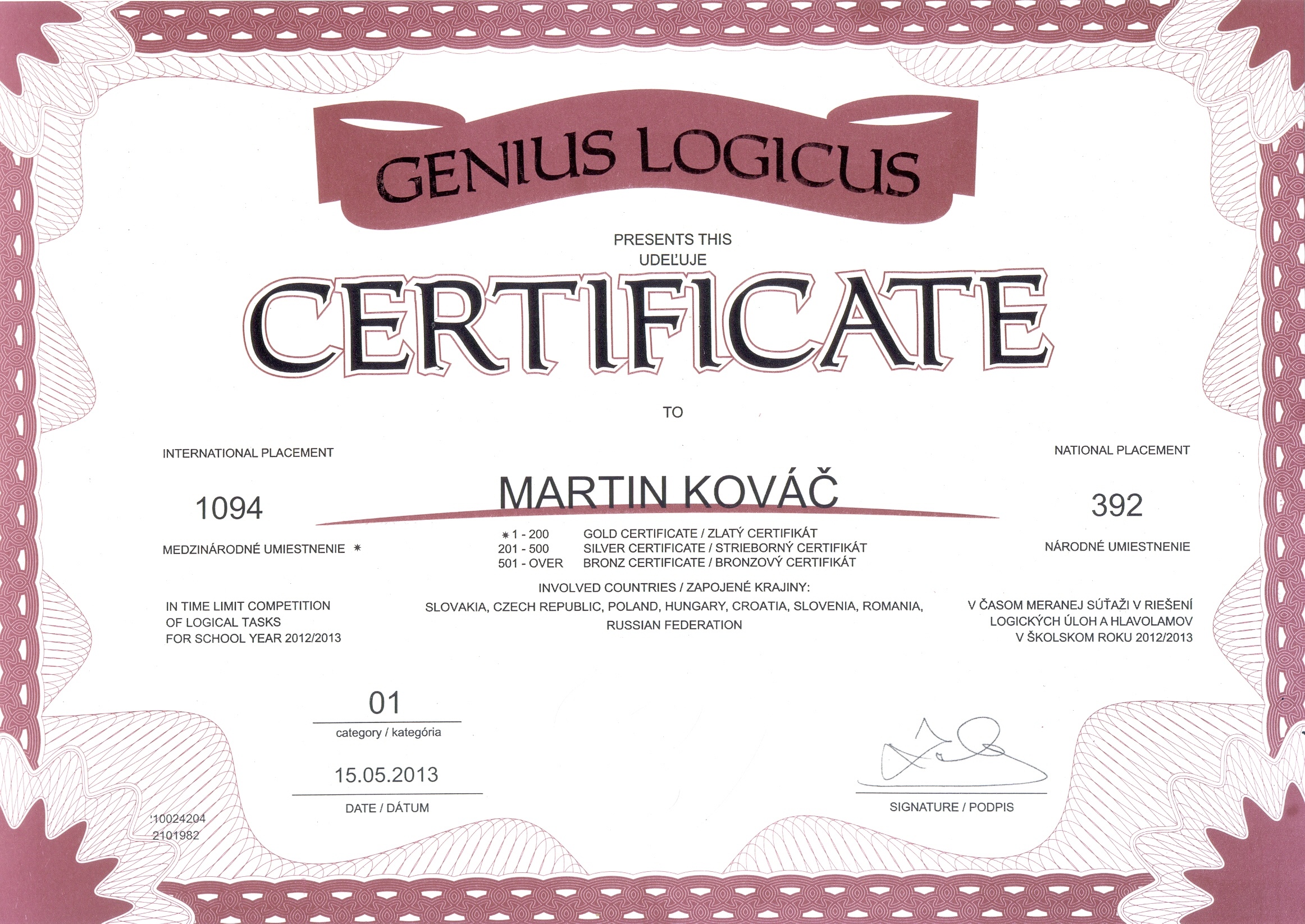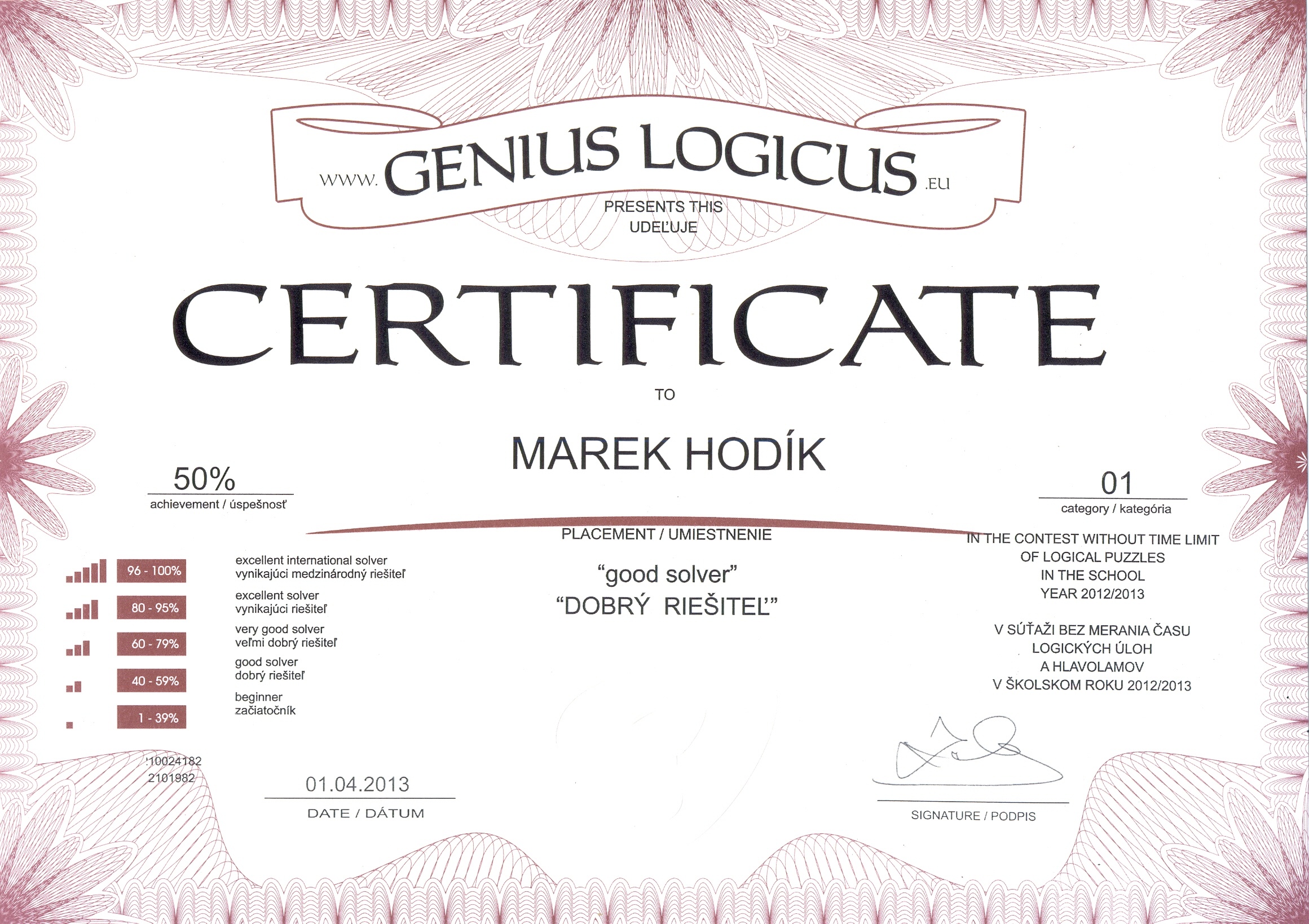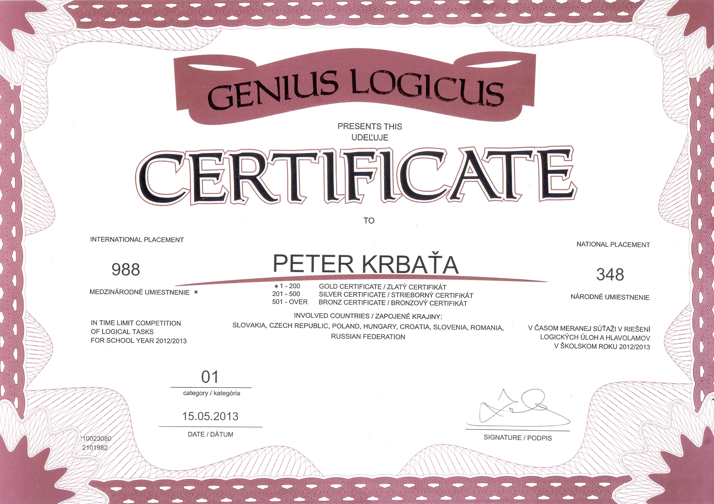 Aj v školskom roku 2012/2013 sme na našej škole zorganizovali medzinárodnú informatickú súťaž GENIUSLOGICUS. V tomto školskom roku bolo zapojených do súťaže 23 žiakov. Všetci žiaci súťažli v kategórii "A+B". Katogória "B" s meraním času prebehla 5.apríla 2013, ktorej sa zúčastnilo 17 žiakov z 23 prihlásených. Oficiálne výsledky budú zverejnené do konca školského roku aj na našej webovej stránke. V júni 2013 organizátori súťaže ocenili súťažiacich získanými certifikátmi a koordinátorom súťaže: Mgr. Daniela Filčáková a RNDr. Marián Balažka poďakovali za organizáciu súťaže na našej škole. Mgr. D. Filčáková zapojila ďalších 12 žiakov do súťaže.