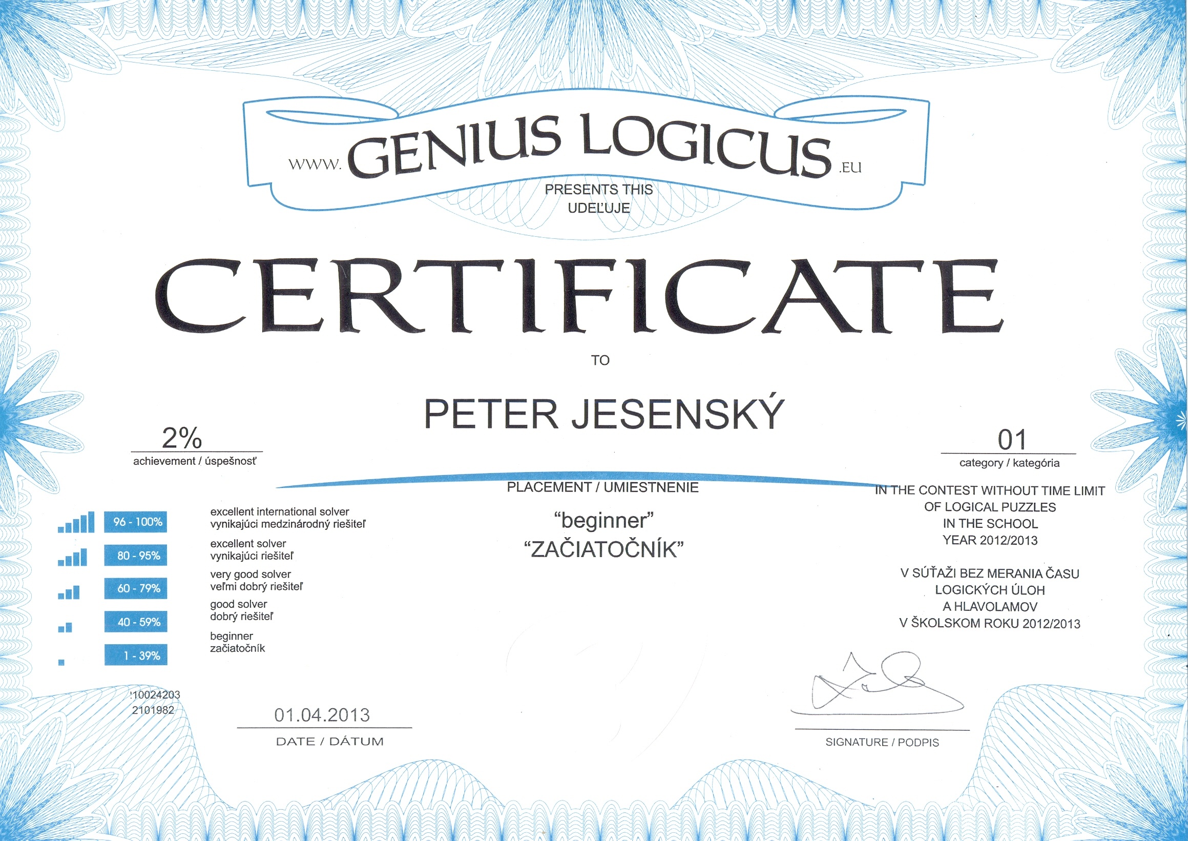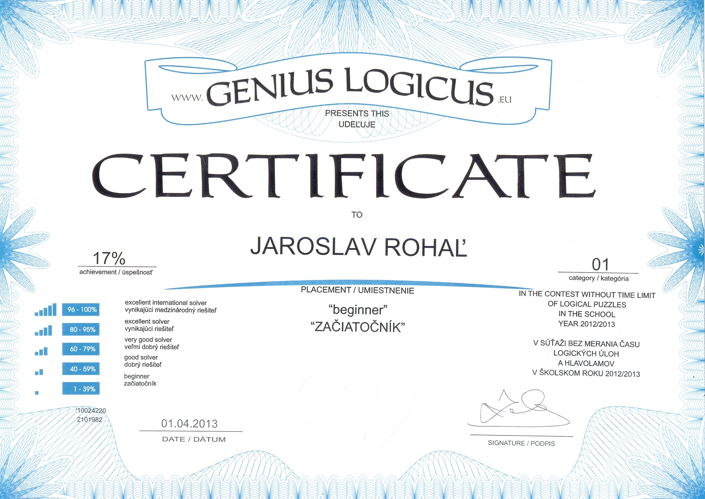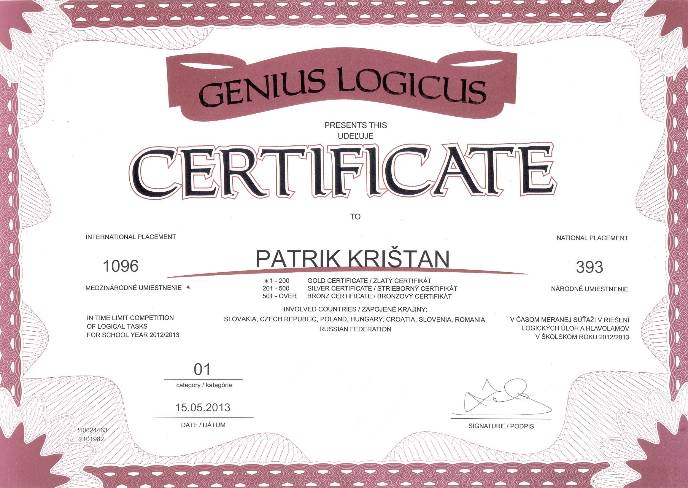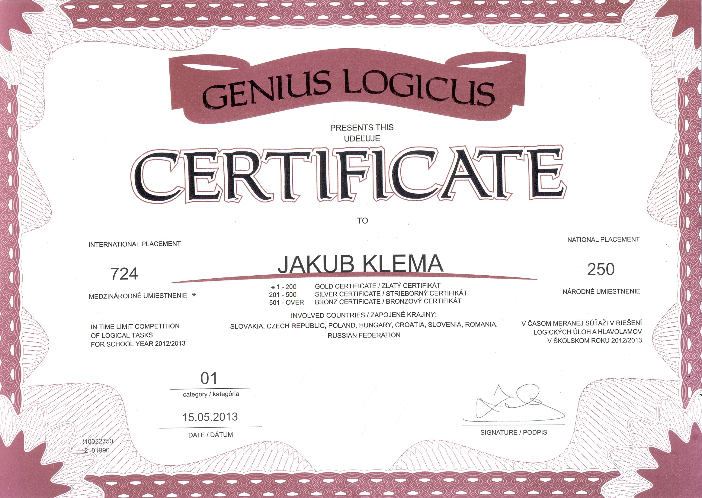 Aj v školskom roku 2012/2013 sme na našej škole zorganizovali medzinárodnú informatickú súťaž GENIUSLOGICUS. V tomto školskom roku bolo zapojených do súťaže 23 žiakov. Všetci žiaci súťažli v kategórii "A+B". Katogória "B" s meraním času prebehla 5.apríla 2013, ktorej sa zúčastnilo 17 žiakov z 23 prihlásených. Oficiálne výsledky budú zverejnené do konca školského roku aj na našej webovej stránke. V júni 2013 organizátori súťaže ocenili súťažiacich získanými certifikátmi a koordinátorom súťaže: Mgr. Daniela Filčáková a RNDr. Marián Balažka poďakovali za organizáciu súťaže na našej škole. Mgr. D. Filčáková zapojila ďalších 12 žiakov do súťaže.