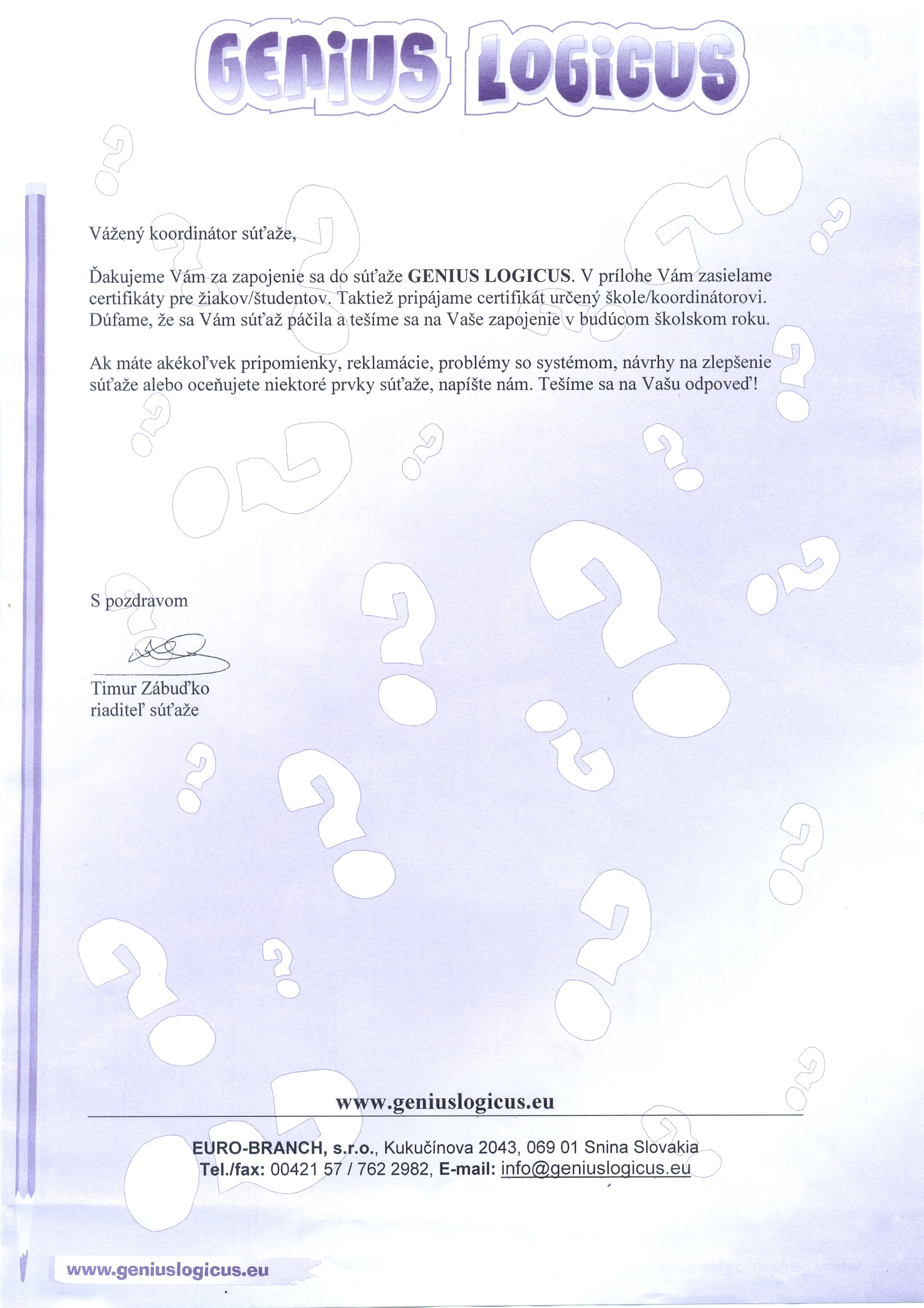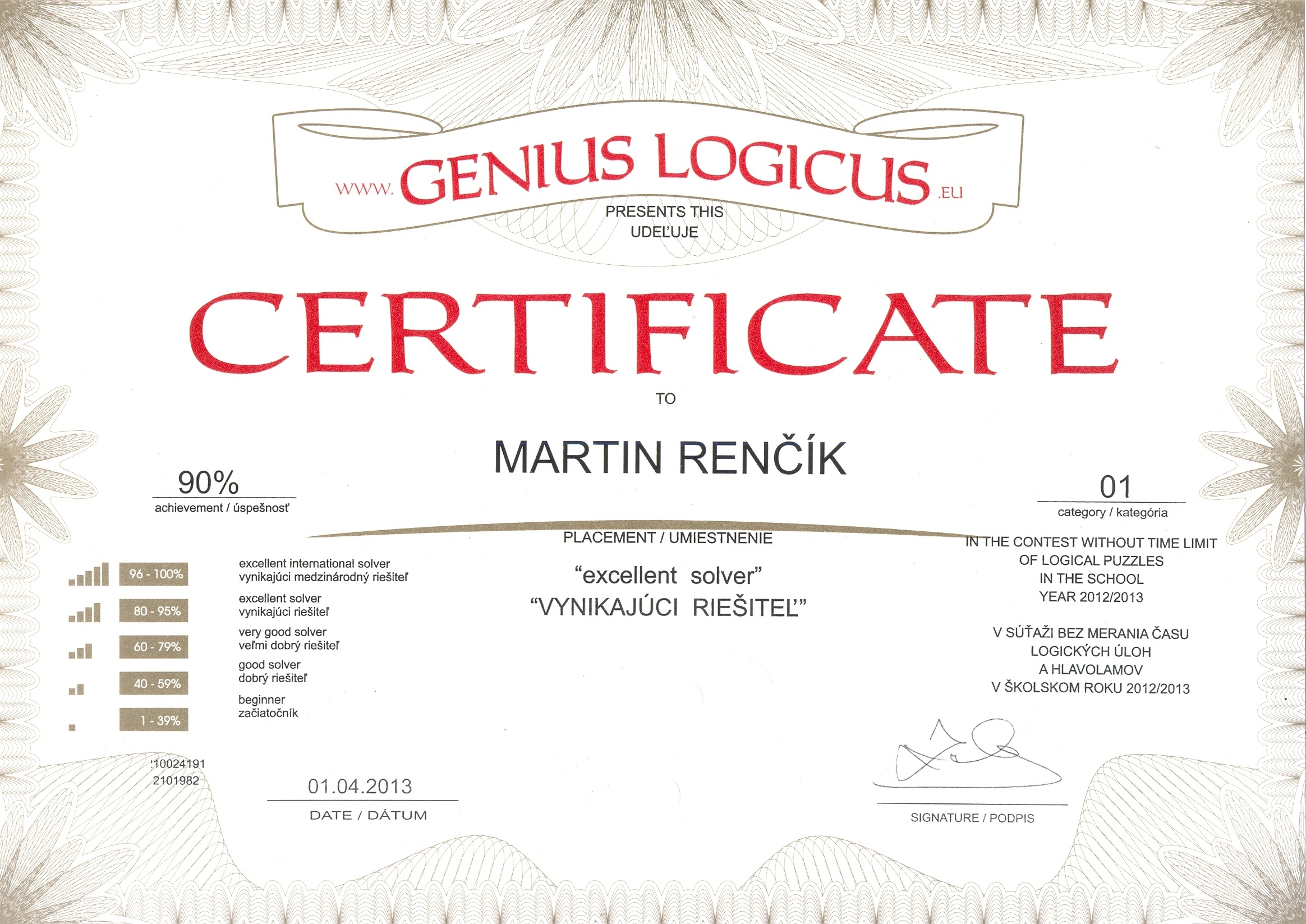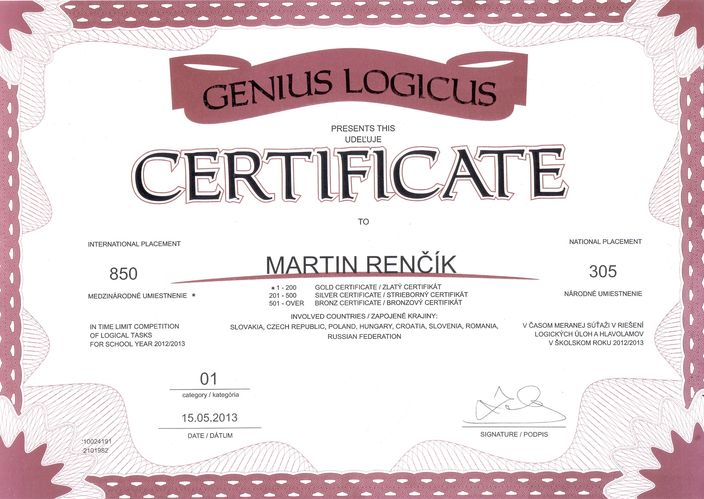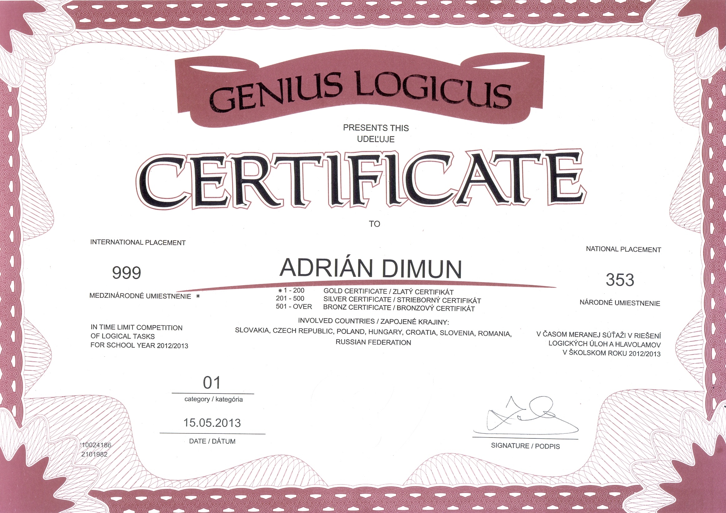 Aj v školskom roku 2012/2013 sme na našej škole zorganizovali medzinárodnú informatickú súťaž GENIUSLOGICUS. V tomto školskom roku bolo zapojených do súťaže 23 žiakov. Všetci žiaci súťažli v kategórii "A+B". Katogória "B" s meraním času prebehla 5.apríla 2013, ktorej sa zúčastnilo 17 žiakov z 23 prihlásených. Oficiálne výsledky budú zverejnené do konca školského roku aj na našej webovej stránke. V júni 2013 organizátori súťaže ocenili súťažiacich získanými certifikátmi a koordinátorom súťaže: Mgr. Daniela Filčáková a RNDr. Marián Balažka poďakovali za organizáciu súťaže na našej škole. Mgr. D. Filčáková zapojila ďalších 12 žiakov do súťaže.