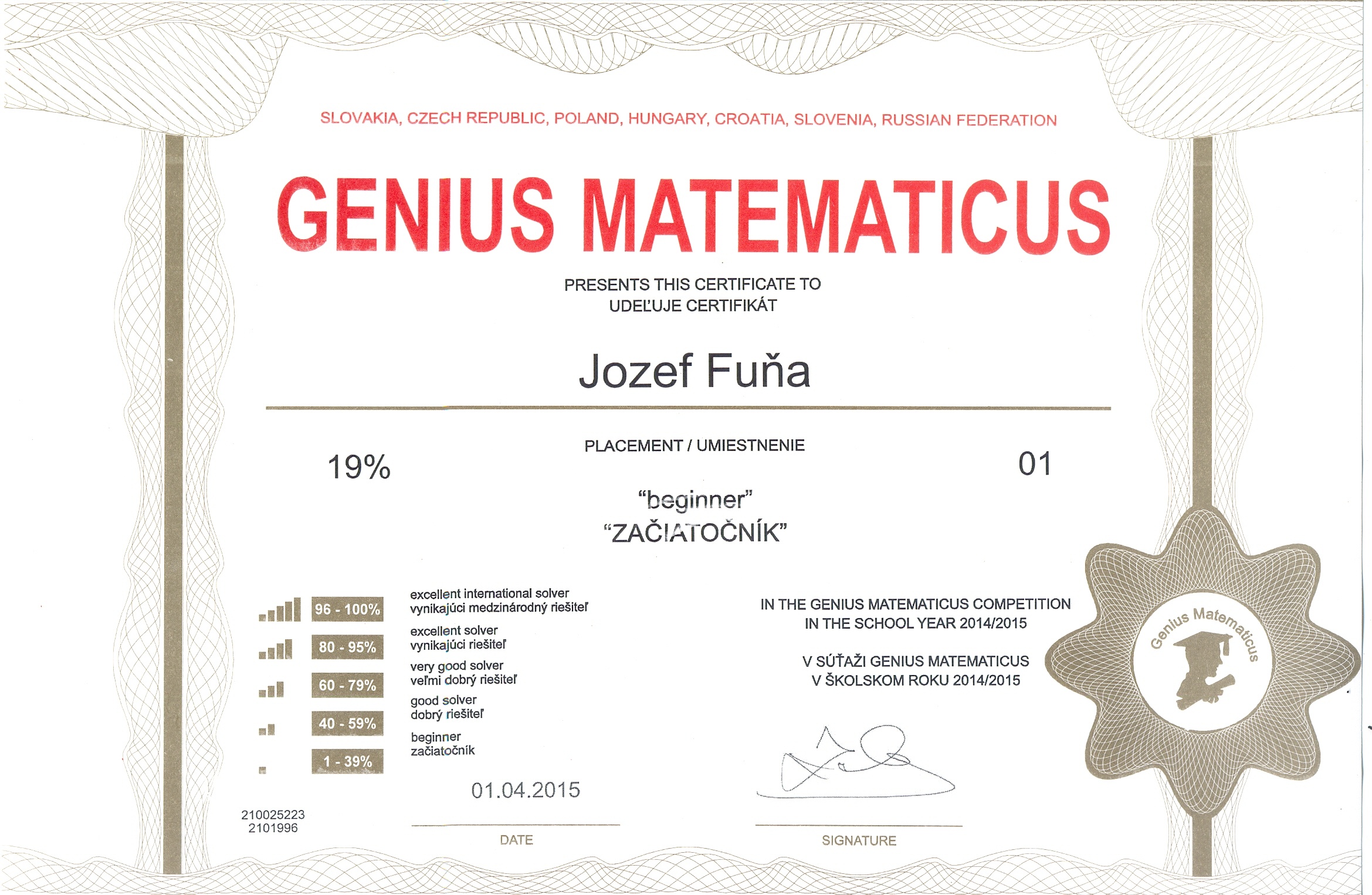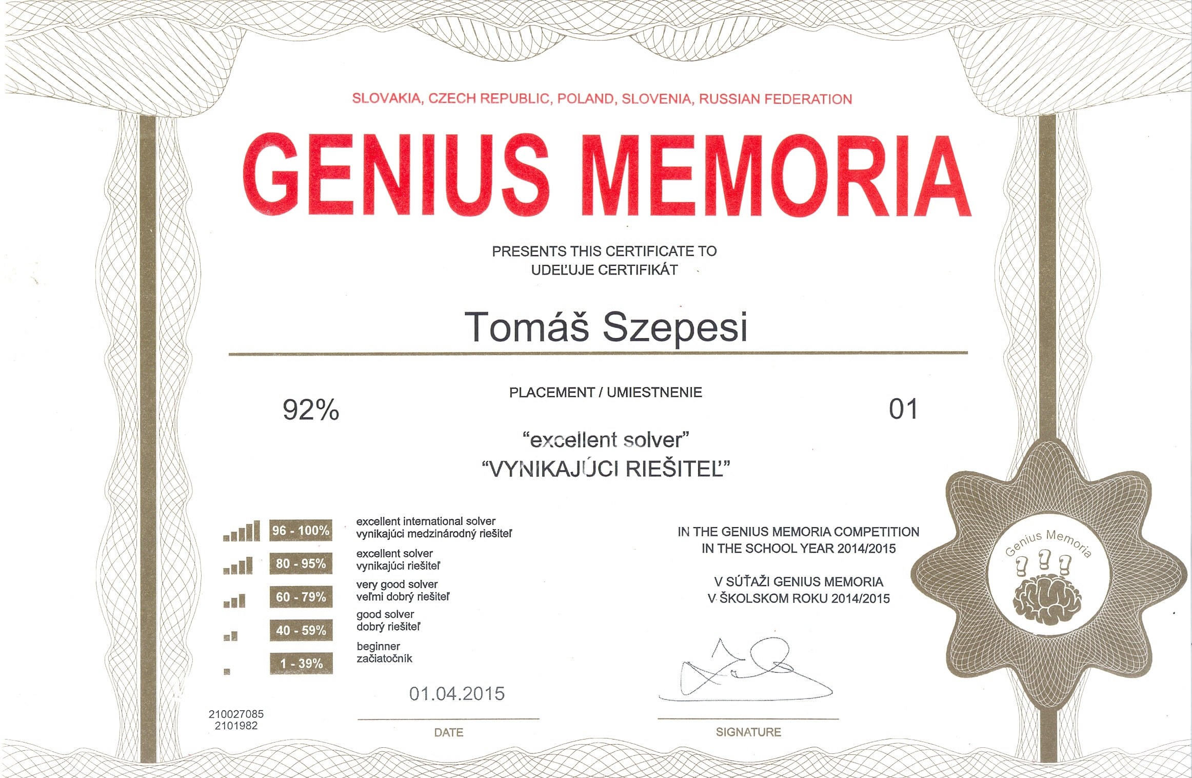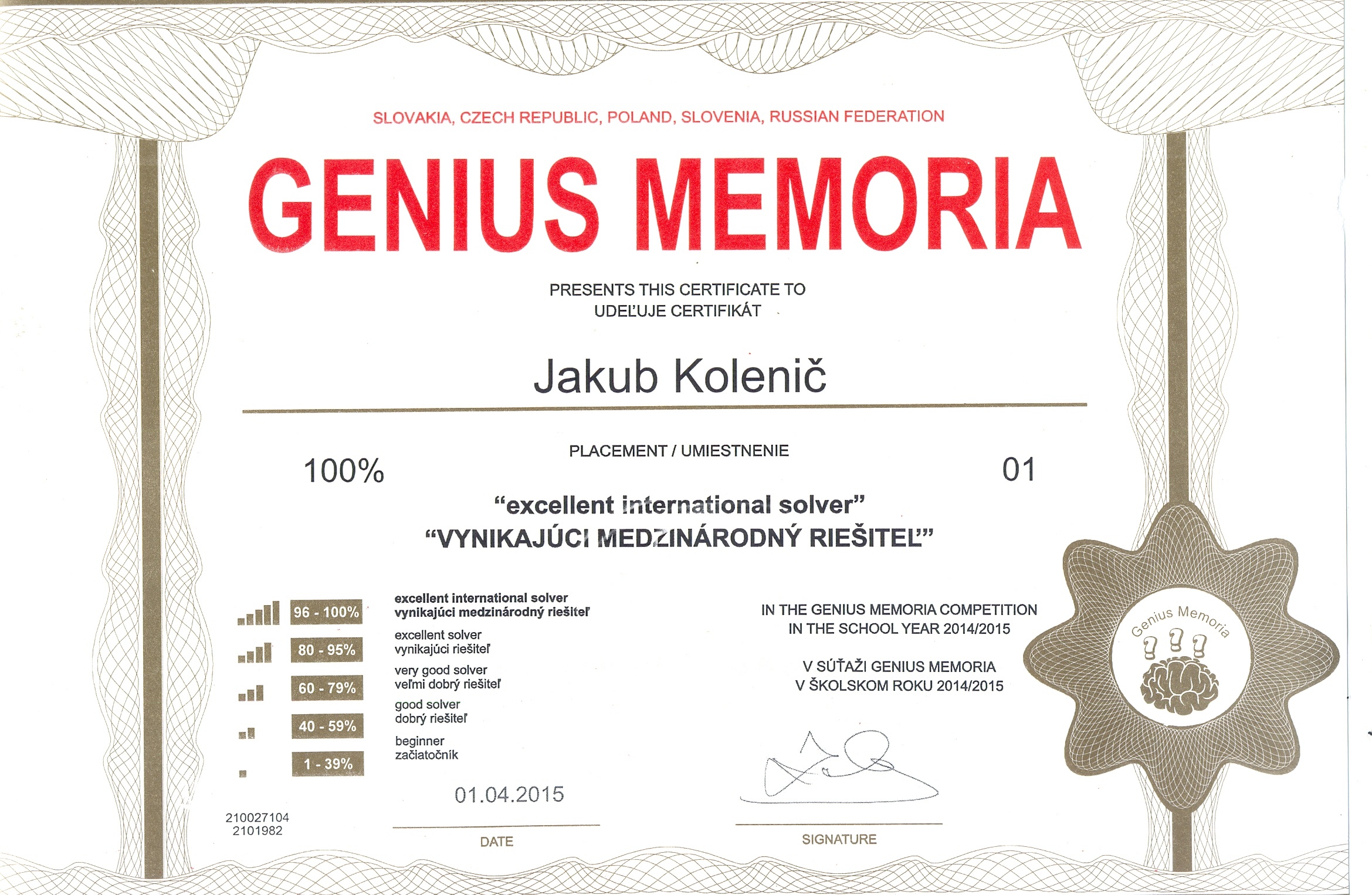 Pozrite si fotogalériu vybraných získaných certifikátov zo súťaží: GeniusLogicus, GeniusMemoria a GeniusMathematicus v školskom roku 2014/2015: