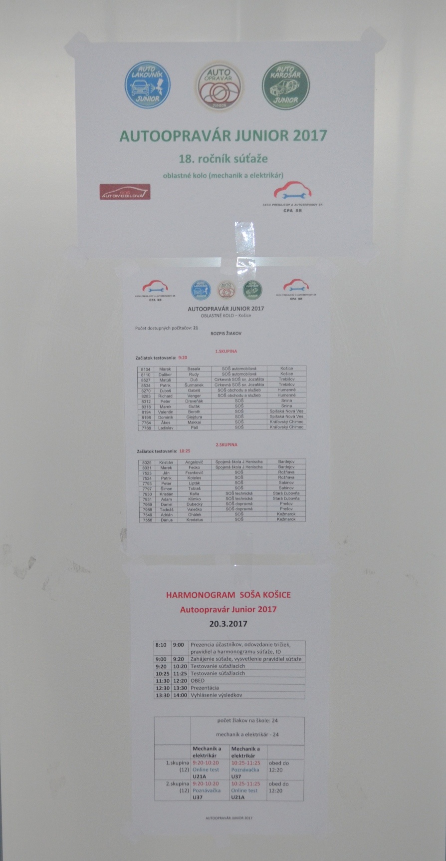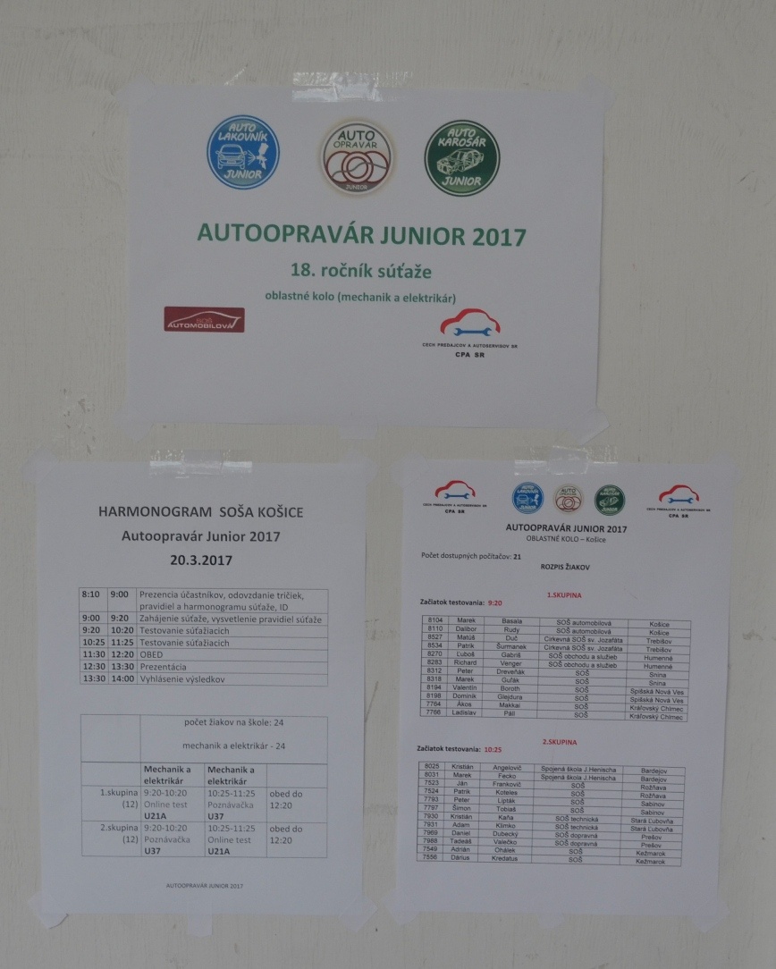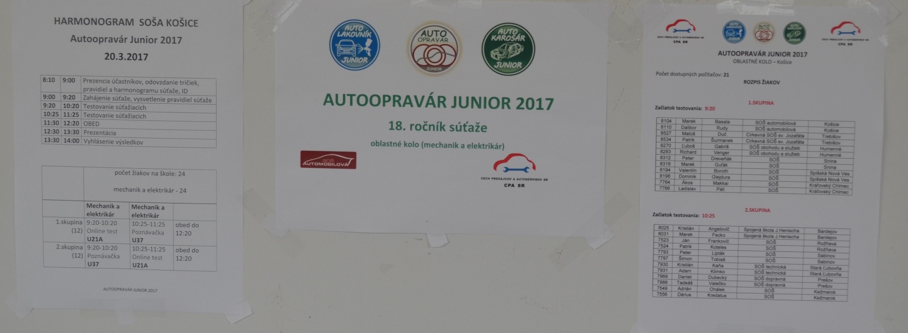 Dňa 20.3.2017 sa v priestoroch SOŠ automobilovej v Košiciach uskutočnilo oblastné kolo (Košický a Prešovský kraj) 18. ročníka súťaže Autoopravár Junior 2017 v kategórii mechanik a elektrikár. Súťažilo 24 žiakov z 12 stredných odborných škôl. Našu školu reprezentoval Marek Basala a Dalibor Rudy z III.B1 triedy. Súťažilo sa v časti: a) ONLINE TESTY, b) POZNÁVACIE ÚLOHY.
