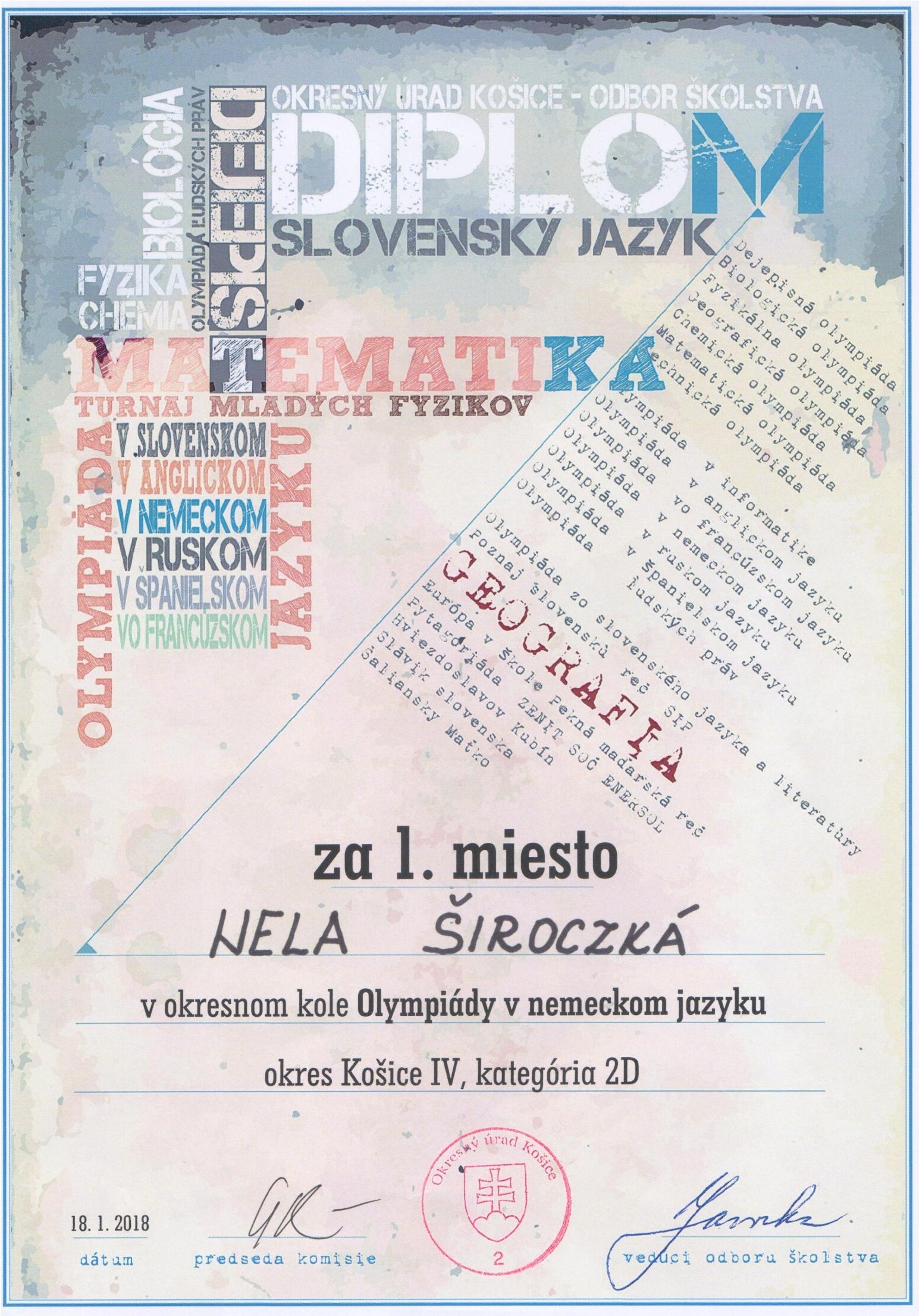 Dňa 18. 1.2018 sa žiačka našej školy – Nela Široczká IV.D zúčastnila okresného kola olympiády z nemeckého jazyka, ktorej organizátorom bola Obchodná akadémia, Polárna 1 v Košiciach.