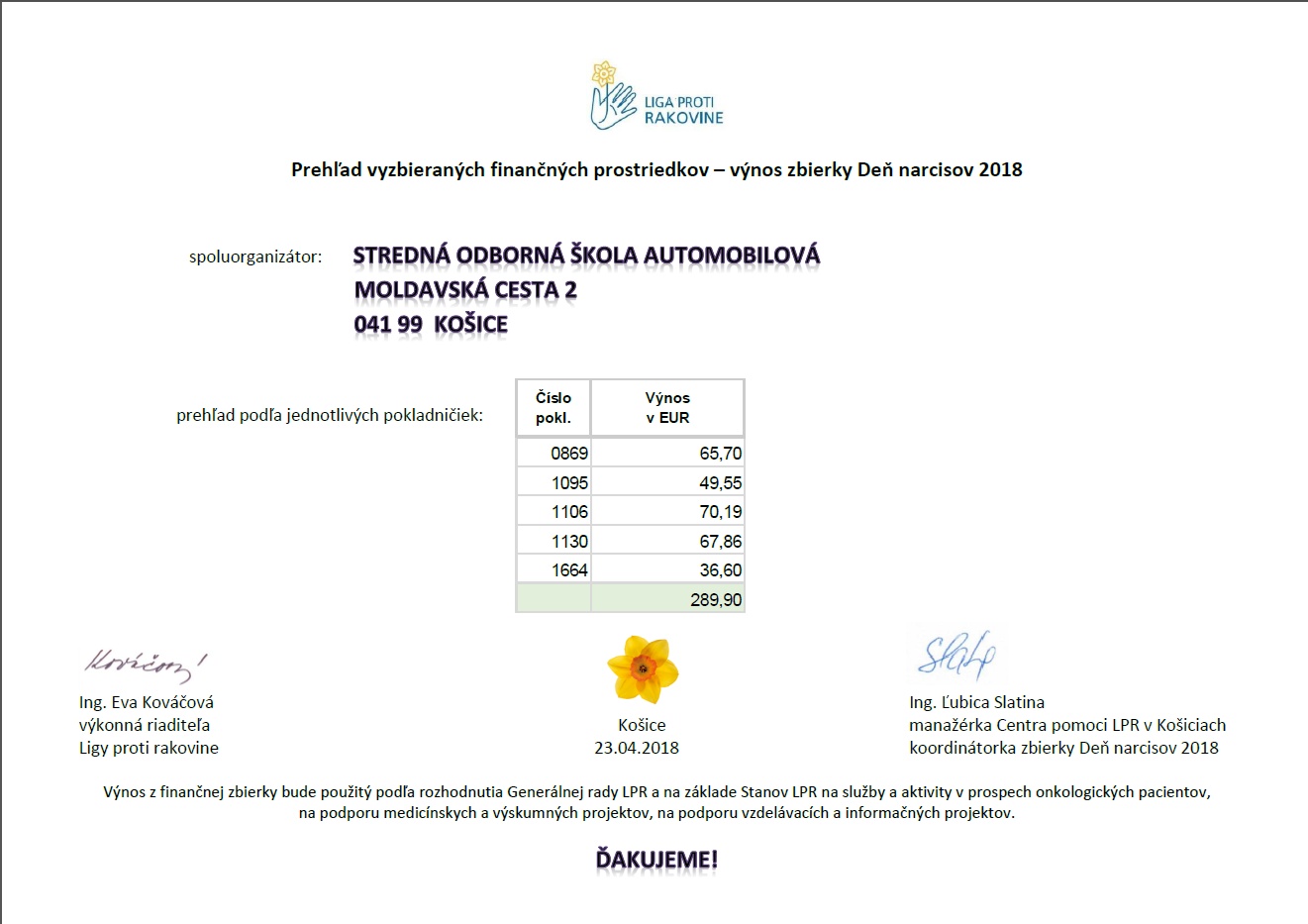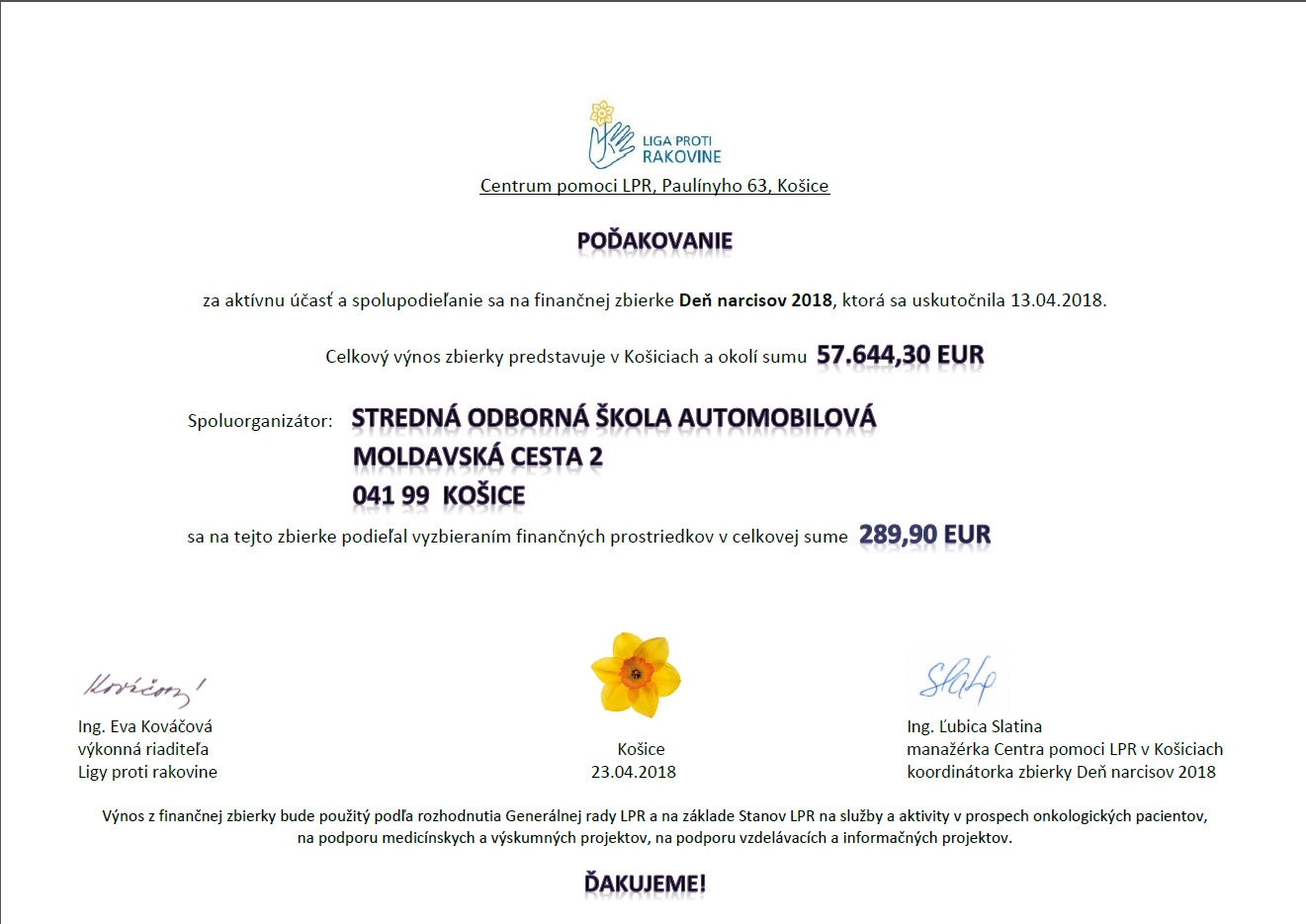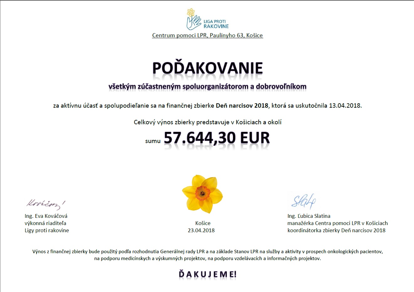 ubehlo niekoľko dní od DŇA NARCISOV – jedinečného dňa, kedy sme sa všetci spojili, aby sme medzi ľudí opäť priniesli malé kvietky symbolizujúce nádej. Tento rok sa za samotným dňom skrývalo opäť veľa práce, námahy, plánovania a množstvo času. Sme radi, že sa s Vami môžeme podeliť o krásny výsledok tohtoročnej zbierky, ktorým je výnos za KOŠICE: 57.644,30 EUR. Prehľad Vami vyzbieraných finančných prostriedkov plus ďalšie poďakovania nájdete vo fotogaérii pripojenej k tejto aktualite. Ďakujeme Vám za spoluprácu, odovzdajte, prosíme, naše úprimné poďakovanie všetkým ľuďom, ktorí sa zbierky zúčastnili. Kompletné celoslovenské výsledky Dňa narcisov 2018 budú známe v najbližších týždňoch, sledujte súčasne našu stránku [2]www.lpr.sk [2]. Dozviete sa tak viac o využití vyzbieraných prostriedkov, ale aj o projektoch pomoci, ktoré môžeme vďaka Dňu narcisov realizovať. Milí priatelia, tradične Vám želáme pevné zdravie, pohodu a spokojnosť. Veríme, že sa spoločne opäť o rok stretneme pri ďalšom ročníku Dňa narcisov. Kolektív Ligy proti rakovine. Pozrite si fotogalériu: RNDr. Marián Balažka